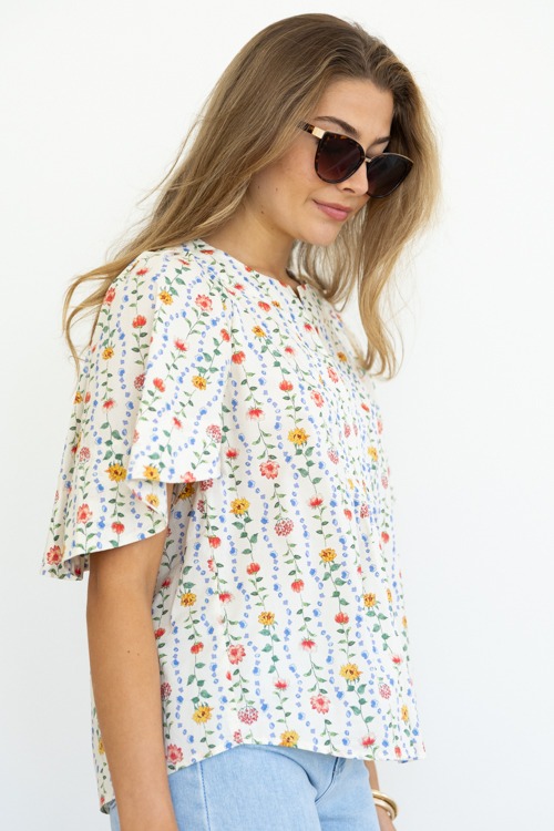 Covered in a Spring-ready floral print, this top is effortlessly beautiful. The fit features strategically placed pleating that helps it to hang easily on the body without clinging or overwhelming your shape. Cape sleeves add to the feminine look.