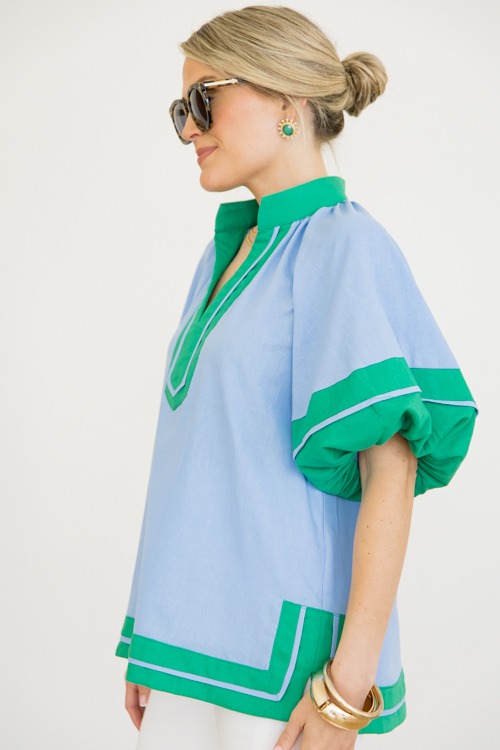 Our best-selling “Kiersten Dress,” now offered in a chic top version! This blouse just gets it right. Crafted from a linen-blend fabric, it was designed with the warmer temps in mind, so you can beat the heat in style. The green colorblock border creates a chic, high-end look. The fit falls loosely on the body for effortless wear, and raglan puff sleeves are the perfect preppy finishing touch.