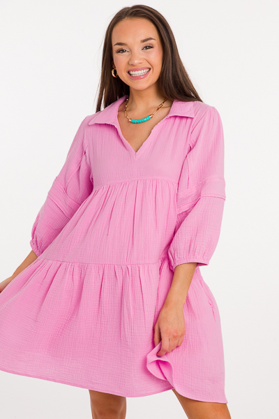 Loose-fitting babydoll dress with a pretty pink color, side pockets, and a puffed gauze fabric. So breezy and easy for spring + summer fashion! Dress is made up of 100% cotton and is lined below the bust.