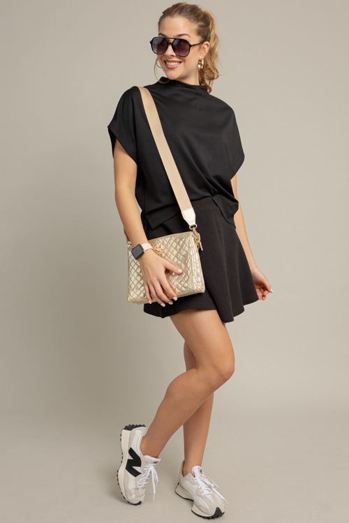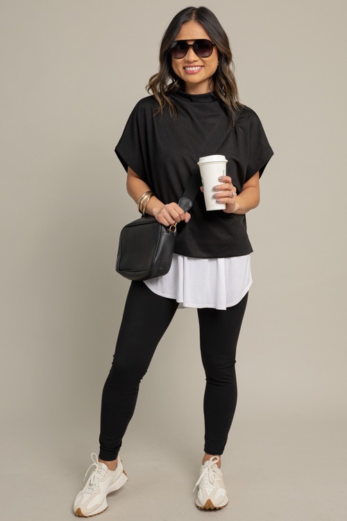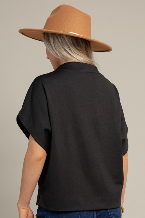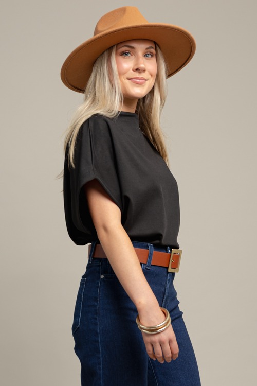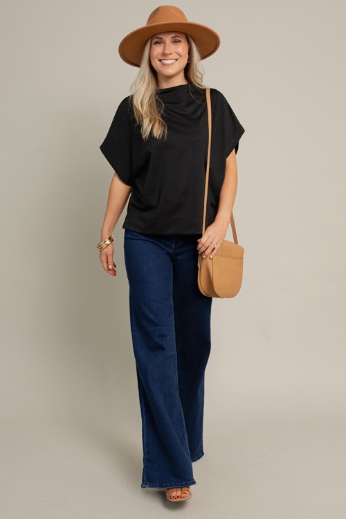 Achieve effortless style with this versatile top. This comfortable black knit top features a sleek mock neck and a relaxed fit. The short dolman sleeves create a modern shape that drapes beautifully without clinging. This easy piece requires minimal effort, making it simple to pair with anything from denim to athleisure for an instantly polished look.